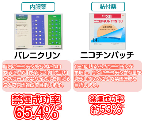 禁煙治療薬として、飲み薬ではバレニクリン。貼り薬ではニコチネルTTS(ニコチンパッチ)が主に処方されます。